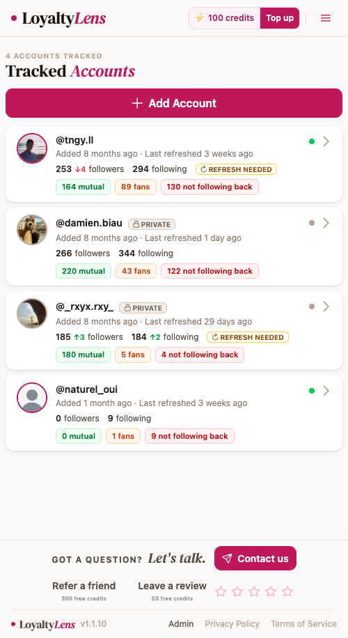 For public accounts, Loyalty Lens runs automatic daily checks without any interaction with the account — no views, no notifications, completely passive. For private accounts you already follow, the Chrome Extension works within your existing Instagram session. Neither method notifies the account being tracked.